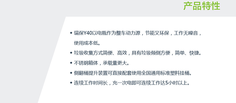 產(chǎn)品亮點(diǎn)●瑞保Y40以電瓶作為整車動(dòng)力源,節(jié)能又環(huán)保,工作無噪音,使用成本低。