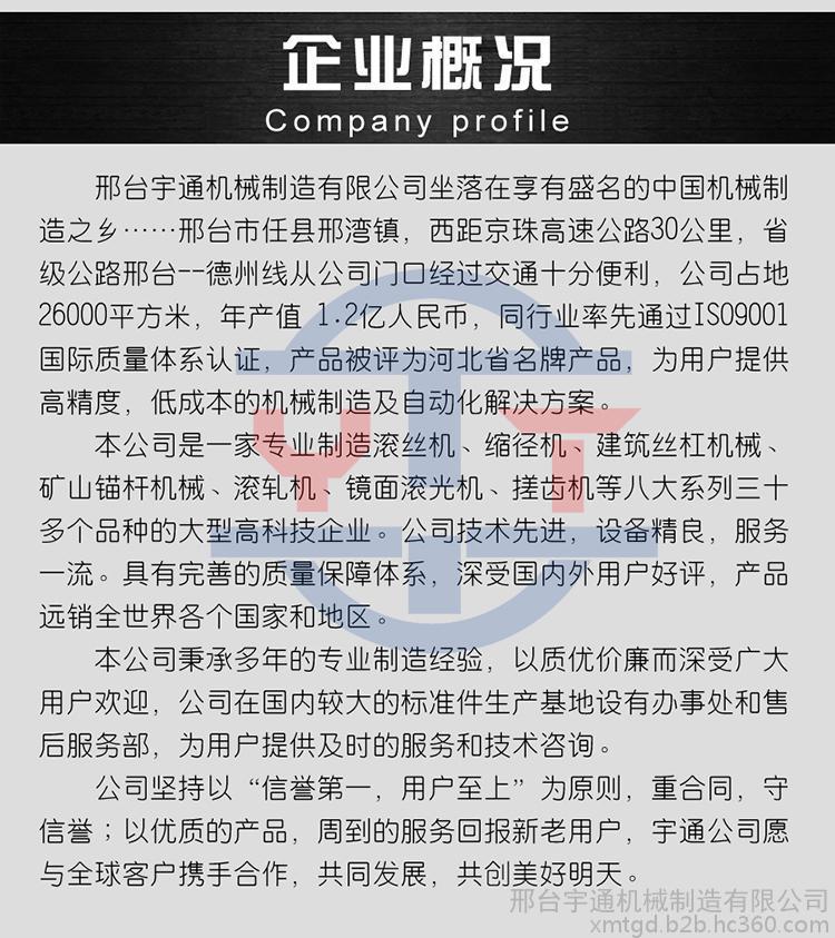 河北省邢臺(tái)宇通機(jī)械專業(yè)生產(chǎn)滾絲機(jī),三軸滾絲機(jī),大型滾絲機(jī),縮徑機(jī)。尤其**開(kāi)發(fā)出幾種新型滾絲機(jī),大型滾絲機(jī),在精度上與加工范圍內(nèi)得到了質(zhì)的飛躍,可根據(jù)各廠家的不同要求特殊設(shè)計(jì)制造非標(biāo)機(jī)型來(lái)滿足客戶。