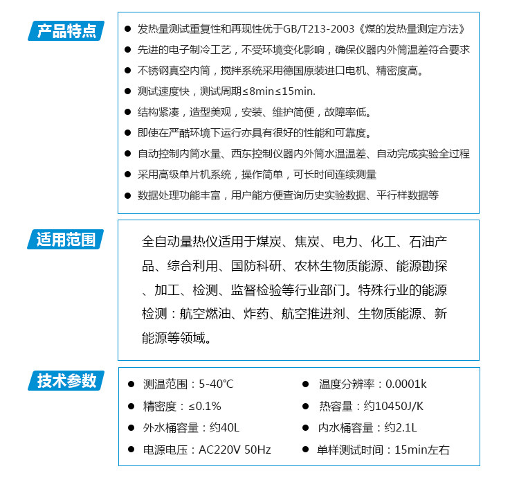 適用于電力、**、冶金、石化、環(huán)保、水泥、造紙、地堪、科研院校等行業(yè)部門測(cè)量**、焦炭及石油等可燃物質(zhì)的發(fā)熱量,符合國(guó)標(biāo)GB/T213-2008《煤的發(fā)熱量測(cè)定方法的要求》及GB/T 14402-2007《建筑材料及制品的燃燒性能、燃燒熱值的測(cè)定》。