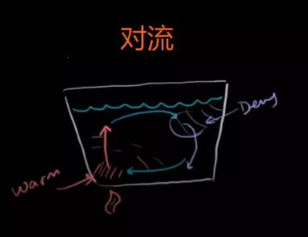在火焰上方的水比其他地方更熱,加熱的水分子加速運(yùn)動(dòng),增加了彼此間的距離,所以該處的密度減小,周圍物質(zhì)就相對(duì)更密集。熱的、密度小的水向上運(yùn)移,下方就有更冷的水從另一端移動(dòng)過(guò)來(lái)補(bǔ)充,這就形成了一個(gè)循環(huán):熱的水上升移動(dòng)到右上方,之后由于降溫密度增大而下沉,然后再次被加熱。這個(gè)過(guò)程本質(zhì)上是熱傳遞,稱為對(duì)流。