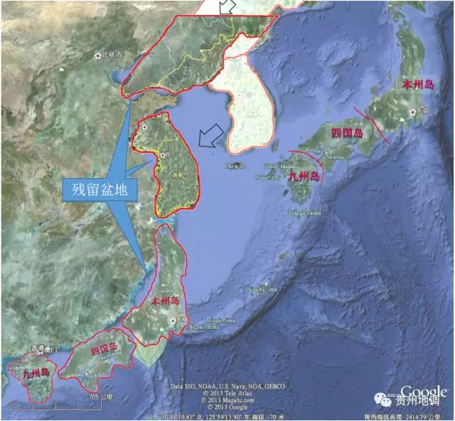 地形地貌、地質、地球物理、古生物等諸多方面的證據說明海日本和朝鮮半島原拼貼于中國東部大陸邊緣(圖2),新生代開始,由于印度板塊北漂、北美板塊擠壓作用于歐亞板塊東北部,加上大西洋裂解使得歐亞板塊整體東移,造成了中國大陸東部的裂解。該構造運動使得朝鮮半島從中國華北裂解漂移到達當前位置,同步形成了渤海灣和黃海;同時使得日本三個主體島(本洲島、四國島、九洲島)從中國華南大陸東緣裂解并發(fā)生漂移,同步形成了東海和琉球群島。事實上,俄羅斯的堪察加也是從中國東北部分裂漂移出去的,同步形成了千島群島島弧帶。