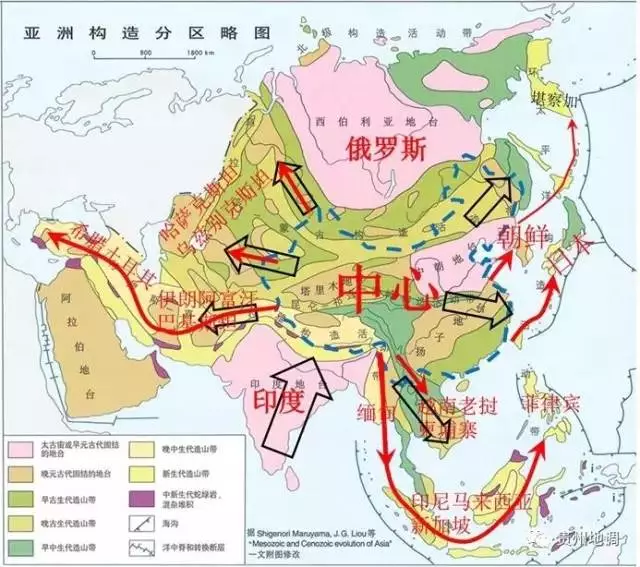 圖1中國是20多個國家的中心(據亞洲構造略圖修編)