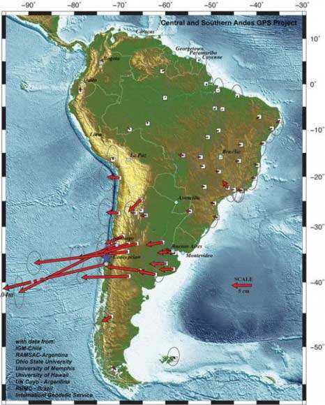 智利東倚安第斯山脈,西臨太平洋海溝。根據(jù)現(xiàn)代板塊學(xué)說的觀點,智利正處于納斯卡板塊與南美洲板塊相互碰撞的地帶。納斯卡板塊的絕對運(yùn)動速度,經(jīng)校準(zhǔn)為每年3.7厘米,是所有板塊中絕對運(yùn)動速度最快的之一。