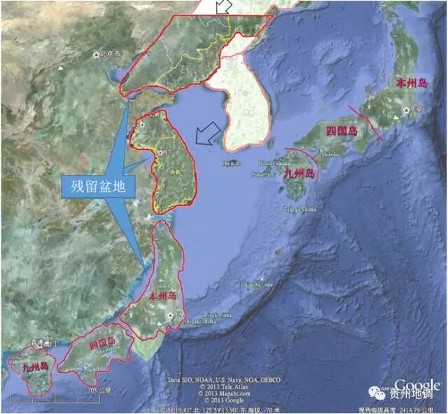 地形地貌、地質(zhì)、地球物理、古生物等諸多方面的證據(jù)說明海日本和朝鮮半島原拼貼于中國東部大陸邊緣(圖2),新生代開始,由于印度板塊北漂、北美板塊擠壓作用于歐亞板塊東北部,加上大西洋裂解使得歐亞板塊整體東移,造成了中國大陸東部的裂解。該構(gòu)造運動使得朝鮮半島從中國華北裂解漂移到達當(dāng)前位置,同步形成了渤海灣和黃海;同時使得日本三個主體島(本洲島、四國島、九洲島)從中國華南大陸東緣裂解并發(fā)生漂移,同步形成了東海和琉球群島。事實上,俄羅斯的堪察加也是從中國東北部分裂漂移出去的,同步形成了千島群島島弧帶。