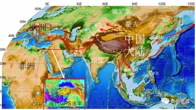 中國有世界上獨一無二極為獨特的大地構(gòu)造演化歷史,她由多個大陸板塊拼合而成,但俗話說,分久必合,合久必分,新生代(6500萬年)以來發(fā)生了大規(guī)模裂解;主因是印度板塊向北強烈擠壓作用于歐亞板塊,在中國及鄰區(qū)形成了巨型的構(gòu)造帶;伴隨著這種擠壓,受阻于剛性的俄羅斯西伯利亞地臺而形成擠出構(gòu)造,這種擠出向東西兩個方向進行(圖1);隨之發(fā)生了大規(guī)模大陸板塊的水平漂移。圖1表明中國大陸是20多個國家的中心,也就是說這20多個國家是從中國大陸分離漂移出去到達當(dāng)前位置的。