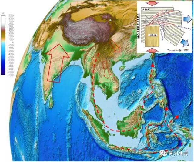 3、東南亞諸國發(fā)源于中國云南新生代之前,印支地塊、婆羅洲地塊、菲律賓地塊等本位于中國揚子板塊和印度板塊之間。印度板塊和揚子板塊6500萬年以前開始發(fā)生軟碰撞,地殼流被同步擠出,驅(qū)動印支地塊及前面的婆羅洲地塊、菲律賓等地塊向東南漂移。菲律賓地塊在大約2400萬年-1600萬年受到南來的澳大利亞板塊向北漂移,發(fā)生碰撞,轉(zhuǎn)而向北漂移(圖3)。也就是說越南、老撾、緬甸、柬埔寨、菲律賓、馬來西亞、新加坡、印度尼西亞等國都是從中國云南東南部被擠壓漂移到達當(dāng)前位置的。