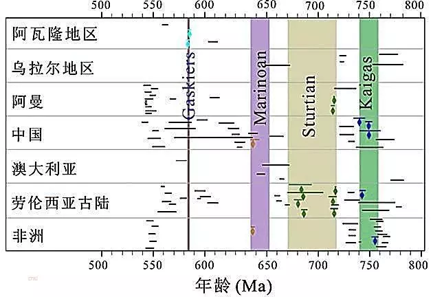 新元古代冰期發(fā)生的次數(shù)、年齡、分布范圍,以及其成因機制等問題還存在著很大的爭議,所以設(shè)立了IGCP-512國際對比計劃,協(xié)調(diào)各國的研究。科學(xué)家通過冰川沉積物的成分、結(jié)構(gòu)、構(gòu)造認識古冰川活動遺跡,應(yīng)用一些地球化學(xué)的指標和給巖石或地層測定年齡的手段,最終確定新元古代時期有4次冰期,并限定了每個冰期的大致時間范圍,其中有兩次是全球性的冰期——Sturtian冰期(司圖特冰期,7.18~6.60億年)和Marinoan冰期(馬林諾冰期,6.51~6.35億年),和另外兩次小的或是局部的冰期——Kaigas冰期(凱噶斯冰期,7.57~7.41億年)和Gaskiers冰期(噶斯奇厄斯冰期,5.837~5.821億年)。Marinoan冰期的全球化程度最高,對應(yīng)于通常所說的“雪球地球”事件。