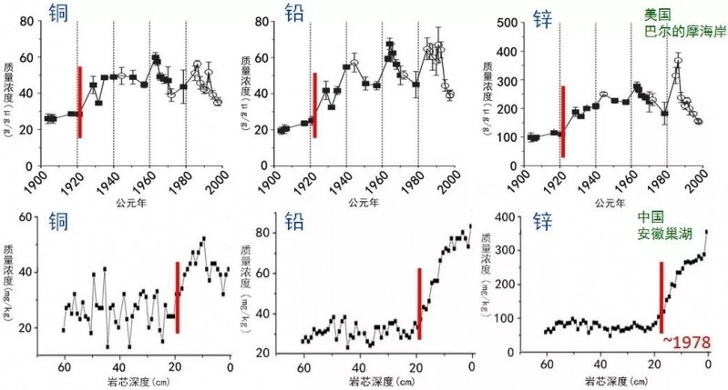在上個世紀,兩次世界大戰(zhàn)刺激產(chǎn)生了很多新技術(shù),如有機化工、核能、計算機、噴氣式飛機等,這使歐美資本主義國家的生產(chǎn)力率先飛速發(fā)展。而在我國,直到1978年“改革開放”之后,這些技術(shù)才在經(jīng)濟建設中得到廣泛應用。地層記錄了這個時間差。在美國巴爾的摩港的沉積巖芯中,常用的工業(yè)金屬銅、鋅、鉛的濃度在1920年后就有了明顯的增長。而我國安徽巢湖的巖芯記錄中,這三種金屬在1978年后才有了顯著的增長。