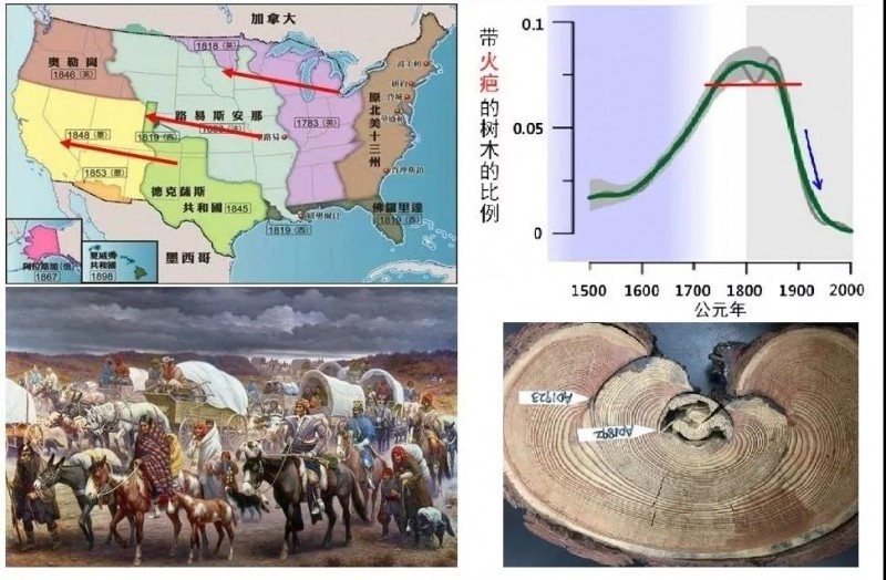 讓我們再回到19世紀。當時在美國淘金群體中流行著一首小曲——《哦,蘇珊娜》:“我打從亞拉巴馬來,還帶著心愛的五弦琴,我要到路易斯安娜州,去尋找我愛人……”后來這首歌成為美國“西進運動”的一個歷史符號,這個歷史事件同時也為生物地質(zhì)體所記錄。有人研究了美國西部的樹輪樣本,發(fā)現(xiàn)在19世紀“西進運動”時有很多火疤記錄,表明當時森林火災頻率很高。這些火災很多是淘金者野炊、抽煙時不慎失火所導致的。針對這個情況,美國政府實行了防火政策,后來火災頻率明顯降低,表現(xiàn)為火疤數(shù)量明顯減少。類似的情況在歐洲也有。17至18世紀的波蘭,很流行森林養(yǎng)蜂,人們在森林中活動,肯定少不了野炊,最終也在很多樹木上留下了火疤。同樣是因為政府加強了對火災的管控,到19世紀火疤數(shù)量明顯減少,即火災頻率顯著下降了。