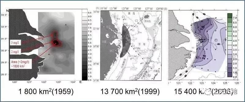 我國在長江口、椒江口、珠江口等城市化程度高、人口密集城市的海岸地區(qū)、近海岸河口區(qū)域以及部分海灣均有發(fā)現(xiàn)低氧區(qū)。科學(xué)家們發(fā)現(xiàn)長江河口外的底層低氧區(qū)面積已高達(dá)13700平方公里、平均厚度高達(dá)20米,其含氧量最低值每升海水只含1毫克,低溶氧區(qū)域的虧損氧總量達(dá)到了1590000 噸。