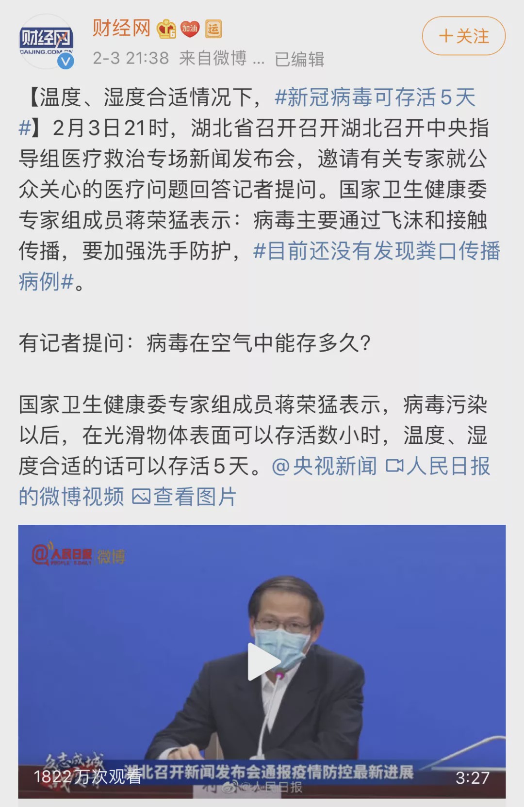 國家衛(wèi)健委專家針對(duì)這個(gè)問題專門做了解釋,說溫度濕度適宜的情況下,病毒體外可存活五天,這不是一個(gè)樂觀的消息。