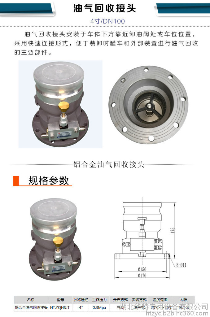 油氣回收接頭安裝于油罐車底部側(cè)邊,當(dāng)油罐車裝油需要油氣回收時(shí),用油氣輸送彎管連接到此接頭的陽(yáng)端上。當(dāng)卸完油后,就用油氣回收防塵蓋蓋到油氣回收接頭陽(yáng)端上,來(lái)防止油氣的外漏等。