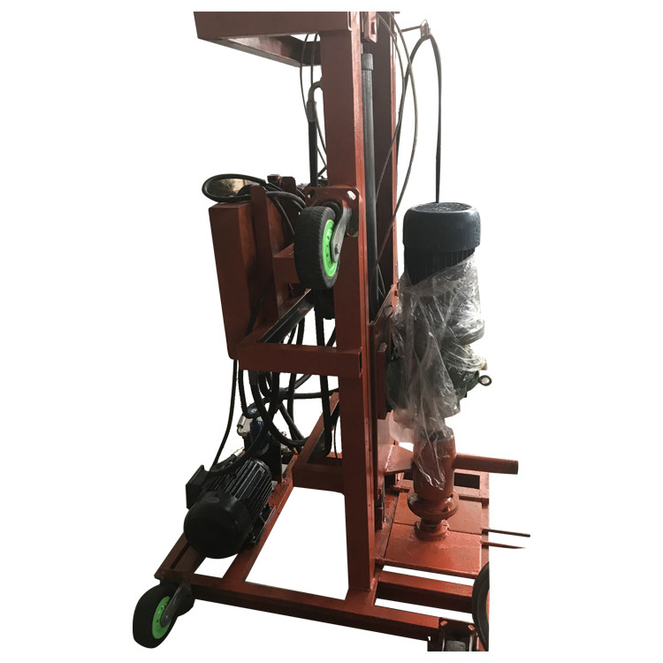 我公司生產的液壓升降電動打井機是一種簡單、方便、經濟、實用的新型機械化打井機,其優(yōu)點是:以小功率,扭矩大、體積小、便攜式、效率高、易操作,噪音小適應各種環(huán)境地形的打井機。該機器使用方便,操作簡單,成孔速度快,每小時10米左右,噪音小,操作極為簡便,單人即可操作,機械自卸鉆桿,以打100米的一眼井為例,鉆桿拆卸平均時耗10分鐘左右,而且移動方便,完成打井作業(yè)后,單人操作即可完成移機工作。