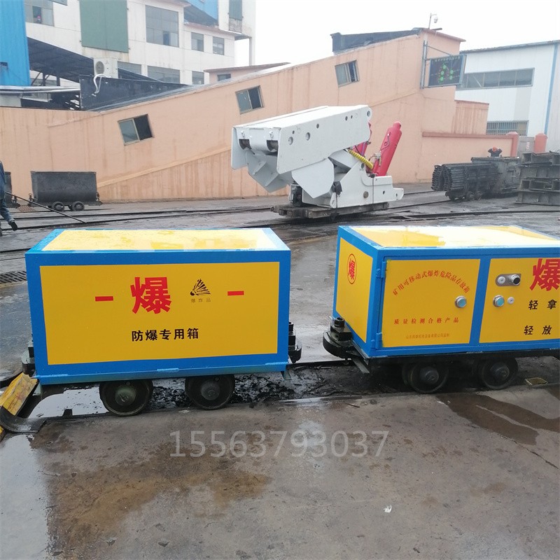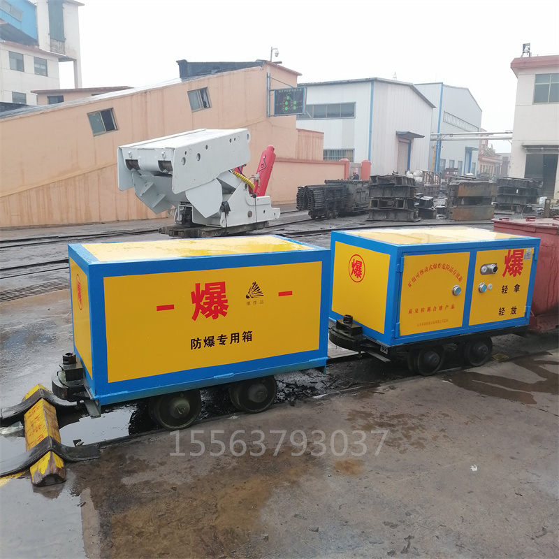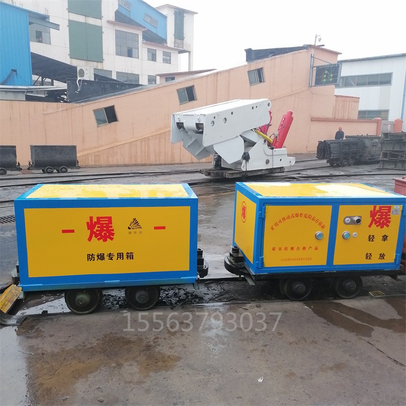 放爆炸物品的礦山專用防爆箱和礦山材料運(yùn)輸車相結(jié)合的一種方式。礦山專用防爆箱的箱體是采用6mm防爆鋼板焊接而成,外部做有磷化處理和防銹處理。內(nèi)層附有10mm絕緣木板,以及在底部鋪有2mm防靜電墊。