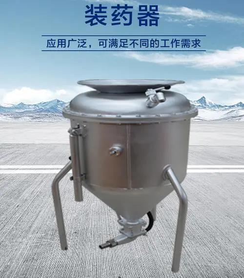 裝藥器由盛藥的缸體 、 控制閥門 、 壓風(fēng)管及一些附件組成。在盛藥缸體內(nèi)一次可裝入50kg 粉狀炸藥。壓風(fēng)通過進(jìn)風(fēng)口流入,同時作為缸體支架的壓風(fēng)管路內(nèi) , 在管路中部分成兩路 ,一路向上通過調(diào)壓閥和上風(fēng)路進(jìn)入缸體內(nèi) ,作用在炸藥上面,形成向下的壓力;另一 路向下,通過底風(fēng)路與輸藥口連通,利用壓風(fēng)的引射作用把炸藥帶入孔內(nèi),同時在缸體下形成負(fù)壓使炸藥向下方移動。裝藥速度可通過調(diào)解風(fēng)壓及輸藥開關(guān)大小來控制 。 為防止炸藥在缸體內(nèi)棚住,在缸體中部裝有攪拌槳。