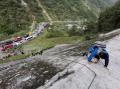 活動(dòng)構(gòu)造室梁明劍、形變室饒?zhí)珖、羅凌三位同志于兩點(diǎn)零八分即從青高所出發(fā),奔赴瀘定地震現(xiàn)場,開展應(yīng)急工作。梁明劍為現(xiàn)場指揮部提供地震地質(zhì)支撐;饒?zhí)珖、羅凌趕赴離震中最近的GNSS站點(diǎn),獲取因全鎮(zhèn)通訊故障導(dǎo)致無法實(shí)時(shí)傳回的GNSS高頻數(shù)據(jù)。在距離磨西鎮(zhèn)還有幾公里處,因道路塌方車輛無法通行,三位同志只能借助梯子、繩索等工具在沒有路的陡坡上攀爬前進(jìn)。到達(dá)震中后,他們迅速開展巡臺(tái)收數(shù)工作,獲取了珍貴的第一手?jǐn)?shù)據(jù)資料。