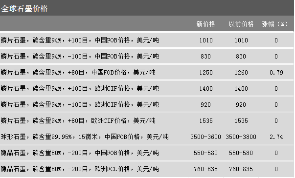 固定碳含量94%的中國(guó)鱗片石墨(-100目)價(jià)格為830美元/噸,歐洲同樣品級(jí)和大小的鱗片石墨售價(jià)為920美元/噸。