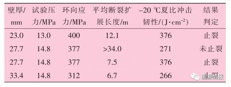 在俄方的試驗(yàn)方案設(shè)計中,試驗(yàn)段由中間一根起裂管、兩側(cè)各三根試驗(yàn)管和外側(cè)各一段70m長儲氣管段組成。主要采集的數(shù)據(jù)包括裂紋長度、裂紋擴(kuò)展速度等。由于不是采用天然氣而是采用空氣進(jìn)行爆破試驗(yàn),采用了不高于-20℃的試驗(yàn)溫度,以及相當(dāng)于1.25~1.5倍工作壓力的試驗(yàn)壓力,以期抵消采用空氣作為試驗(yàn)介質(zhì)的影響,從而獲得較為保守的試驗(yàn)數(shù)據(jù)。其中一次成功止裂的情況如上圖所示,典型試驗(yàn)數(shù)據(jù)見下表。