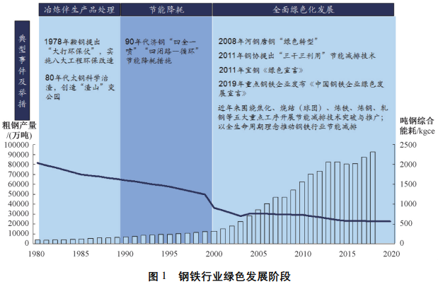 我國鋼鐵行業(yè)是環(huán)保意識覺醒較早的工業(yè)行業(yè),環(huán)保工作一直走在工業(yè)領(lǐng)域的前列。從七十年代至今,鋼鐵行業(yè)的綠色發(fā)展歷經(jīng)了冶煉伴生產(chǎn)品處理、節(jié)能降耗和全面綠色化發(fā)展等 3 個階段,如圖 1 所示。鋼鐵工業(yè)綠色發(fā)展謀求的目標是資源的綜合利用、短缺資源的代用、二次資源的利用,減緩資源的耗用; 通過節(jié)能、節(jié)材、可再生資源和綠色能源的利用達到節(jié)能的目的。同時,減少廢料和污染物的產(chǎn)生和排放,促進工業(yè)產(chǎn)品在生產(chǎn)、消費過程中與環(huán)境相容,降低整個工業(yè)活動對人類和環(huán)境的風險。