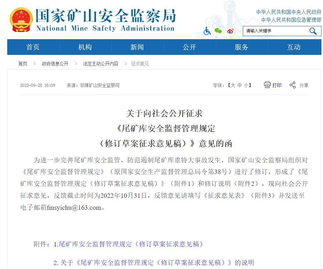 9月28日,國(guó)家礦山安全監(jiān)察局發(fā)布關(guān)于向社會(huì)公開(kāi)征求《尾礦庫(kù)安全監(jiān)督管理規(guī)定(修訂草案征求意見(jiàn)稿)》意見(jiàn)的函,修訂后的《規(guī)定》在人員配備、資質(zhì)要求、庫(kù)址選擇、回采、閉庫(kù)安全等方面有了新要求。小編給讀者提取重點(diǎn),讓讀者快速了解政策新風(fēng)向!