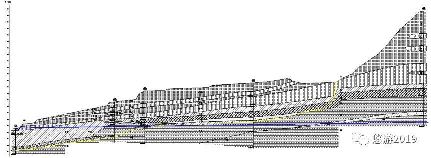 布設(shè)各分區(qū)滑坡的主軸剖面、兩側(cè)輔助剖面、垂直主軸的橫剖面和工程位置剖面。主軸剖面應(yīng)貫穿各級滑坡,了解上、下級之間的關(guān)系?碧缴疃葢(yīng)達(dá)到地質(zhì)調(diào)查推測的最深層滑面以下 3 ~ 5m,不能漏掉深層滑面。其中,有 1 ~ 2 個鉆孔應(yīng)達(dá)到當(dāng)?shù)厍治g基準(zhǔn)面(如河底)或開挖面以下 3 ~ 5m,防止漏掉深層滑面。