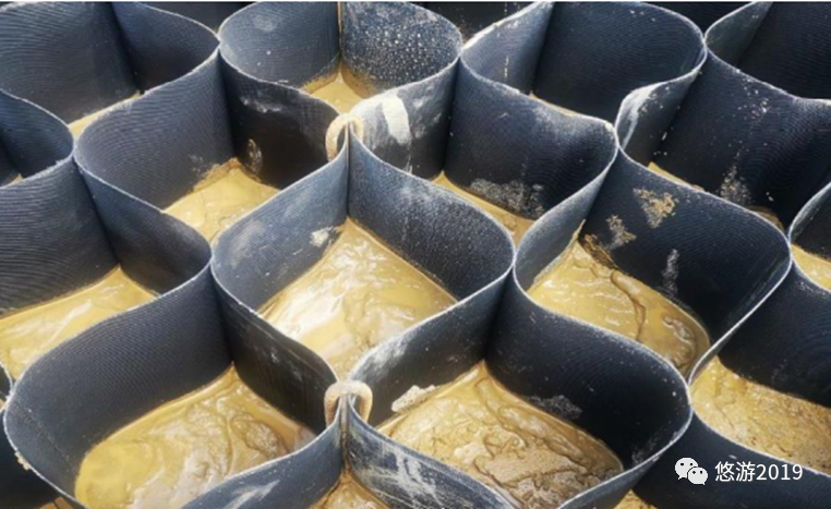 1)水平向增強(qiáng)體:主要通過(guò)設(shè)置土工合成材料,如土工格柵、土工格室、土工布等材料,利用土工合成材料與土體之間巨大力學(xué)差異性,通過(guò)協(xié)調(diào)受力實(shí)現(xiàn)互補(bǔ)而提高地基承載力。即通過(guò)土體對(duì)筋體提供的摩阻力和筋體對(duì)土體提供的約束力,實(shí)現(xiàn)對(duì)土體強(qiáng)度與剛度的改良而達(dá)到提高承載力和提高穩(wěn)定性的目的。筋體的這種改良作用其實(shí)質(zhì)是通過(guò)形成的“圍壓”提供了一個(gè)額外的粘聚力實(shí)現(xiàn)的。