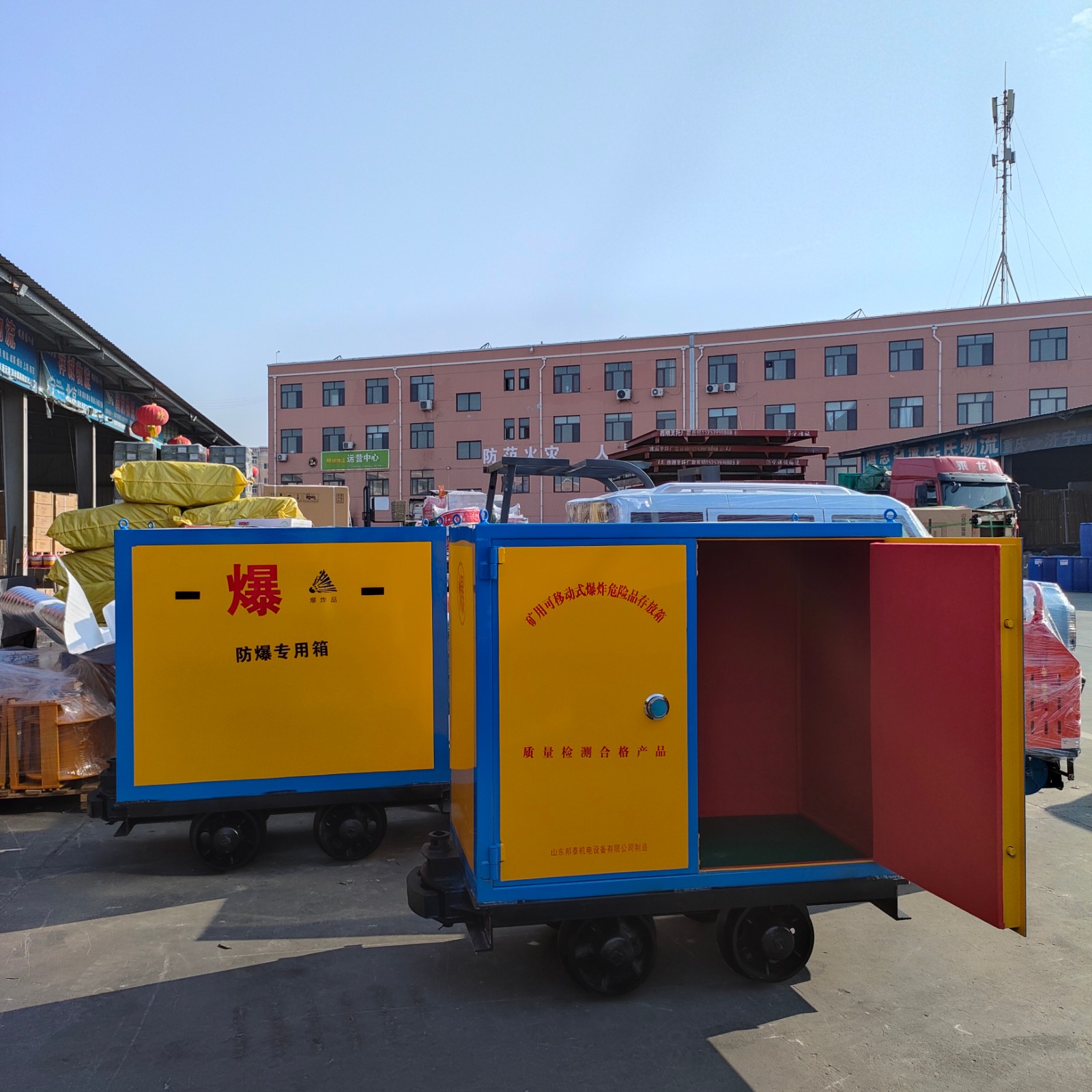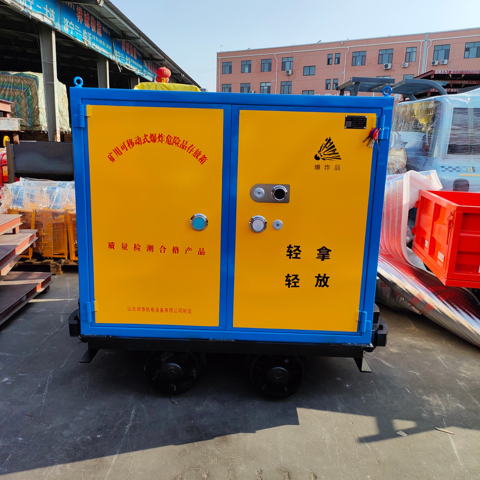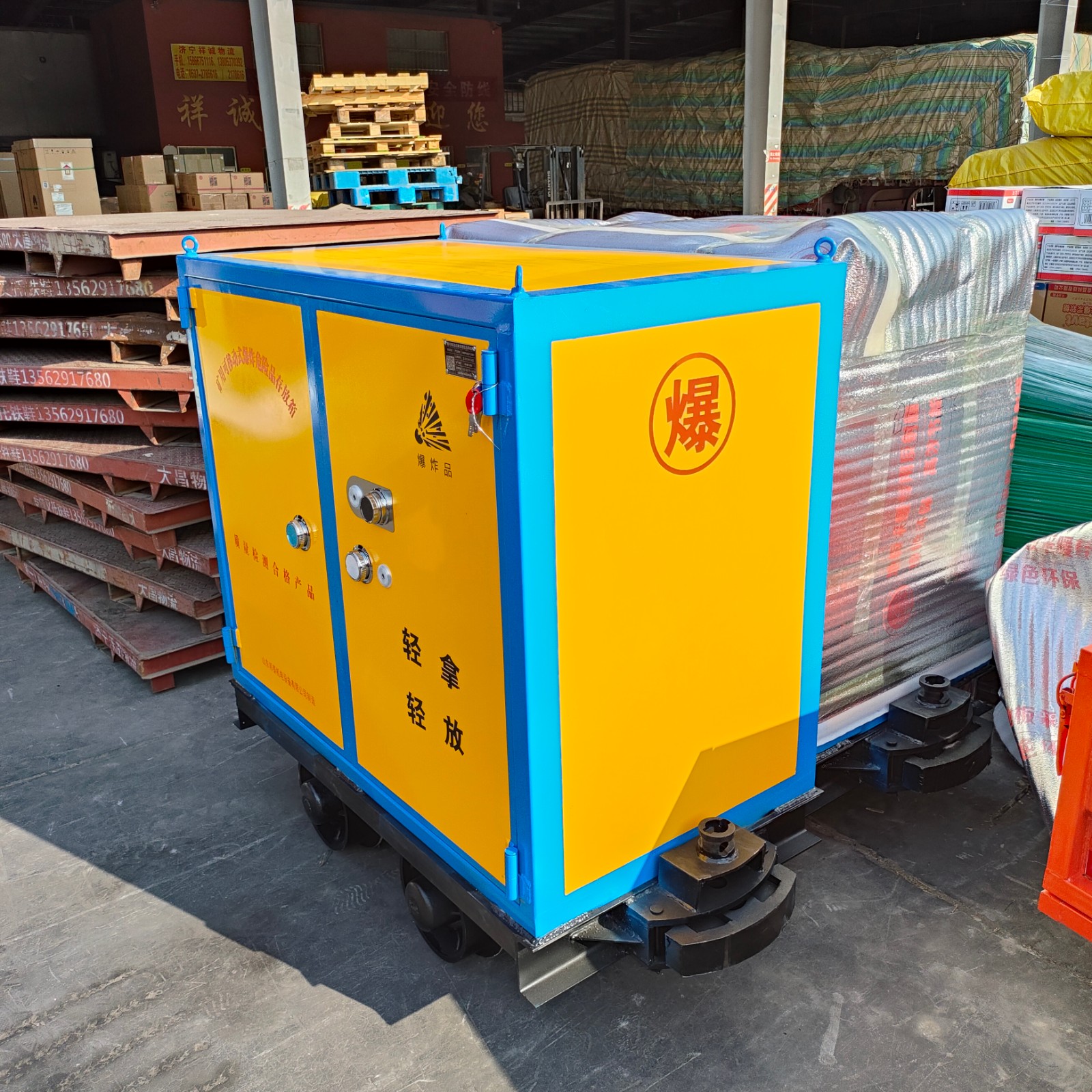火工品炸藥軌道運(yùn)輸車,也叫煤礦有軌式炸藥運(yùn)輸車,井下爆炸物品運(yùn)輸車,運(yùn)輸炸藥箱的礦車,是山東邦泰集團(tuán)生產(chǎn)銷售的產(chǎn)品,有外觀專利。