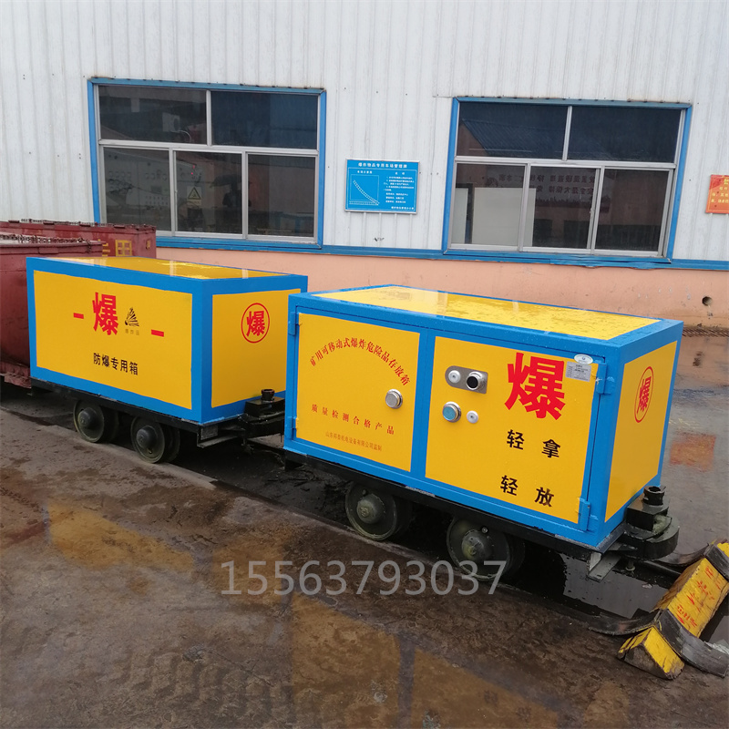 它是由礦車承載輪和防爆存放柜組合而成的,礦車軌距根據(jù)礦山軌道的實際軌距選擇,存放柜要求具有防靜電特性的封閉性強的存放柜,材質(zhì)為鋼板焊接結(jié)構(gòu),鋼板厚度不低于6-8mm,外觀噴涂防銹漆,明顯處帶有“危險品””爆炸”等提示性文字,柜體內(nèi)部是一層絕緣木板和防靜電阻燃?xì)謮|,符合火工品存放要求。