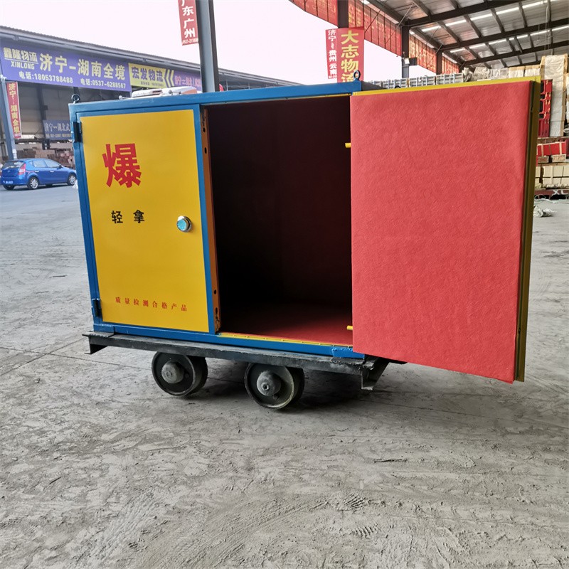 600/762/900軌距一體式炸藥車主要分為兩部分組成; 第一部分是礦用移動式危險品存放箱,門板6.0mm-8.0mm 厚防爆鋼板,內(nèi)置10.0mm 防靜電木板和2.0mm 厚防火防震的阻燃?xì)。另一部分為專用礦車,礦車軌距(600mm/762mm/900mm)。