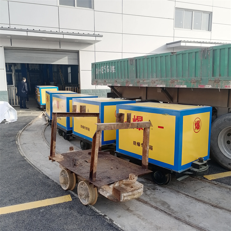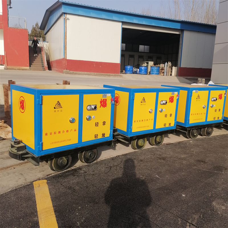 有軌炸藥車是由礦用可移動式爆炸危險品存放箱和講下運輸火工品礦車組成的,也可以說是有車載式炸藥箱(移動式火工品運輸柜)和礦用材料車組成,是為了煤礦和非煤礦山運輸火工品研發(fā)生產(chǎn)的有軌危險品運輸工具。