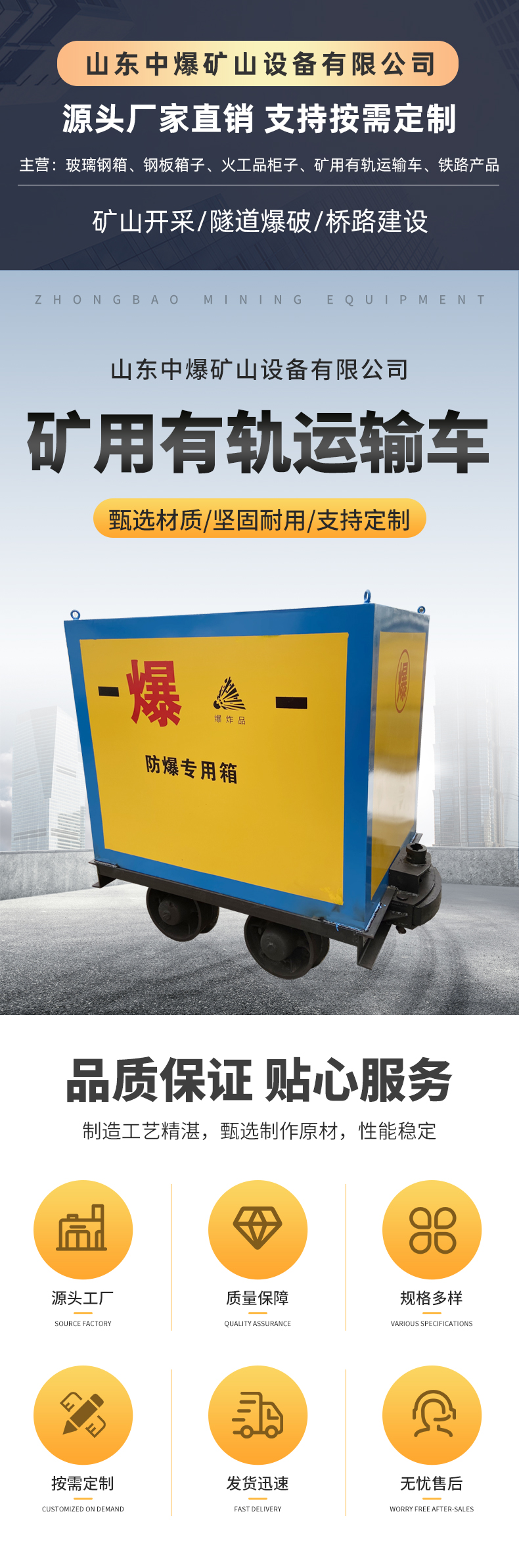 礦用有軌爆炸物品運輸車是井下運輸爆炸物品的運輸車輛,常用規(guī)格由存放300公斤,500公斤,750公斤,1000公斤,1500公斤的軌道炸藥車,由礦上運輸量決定的。