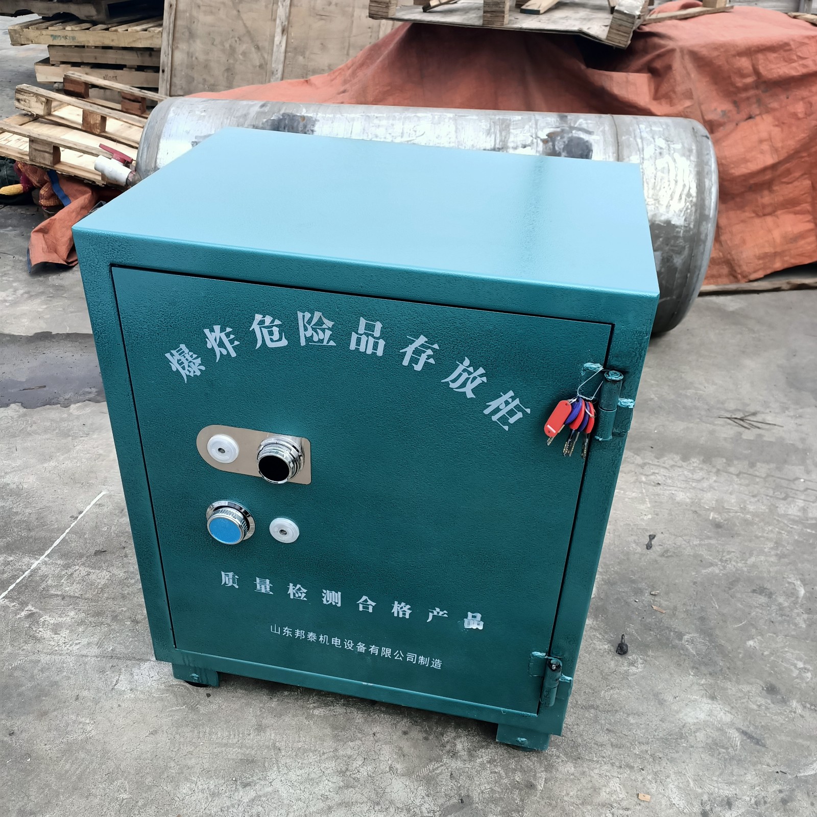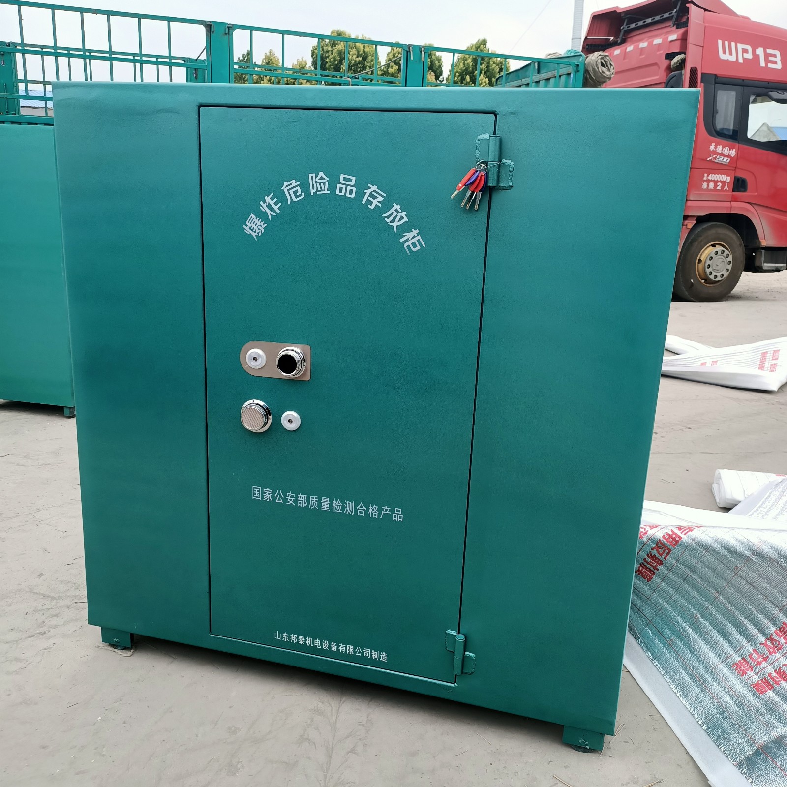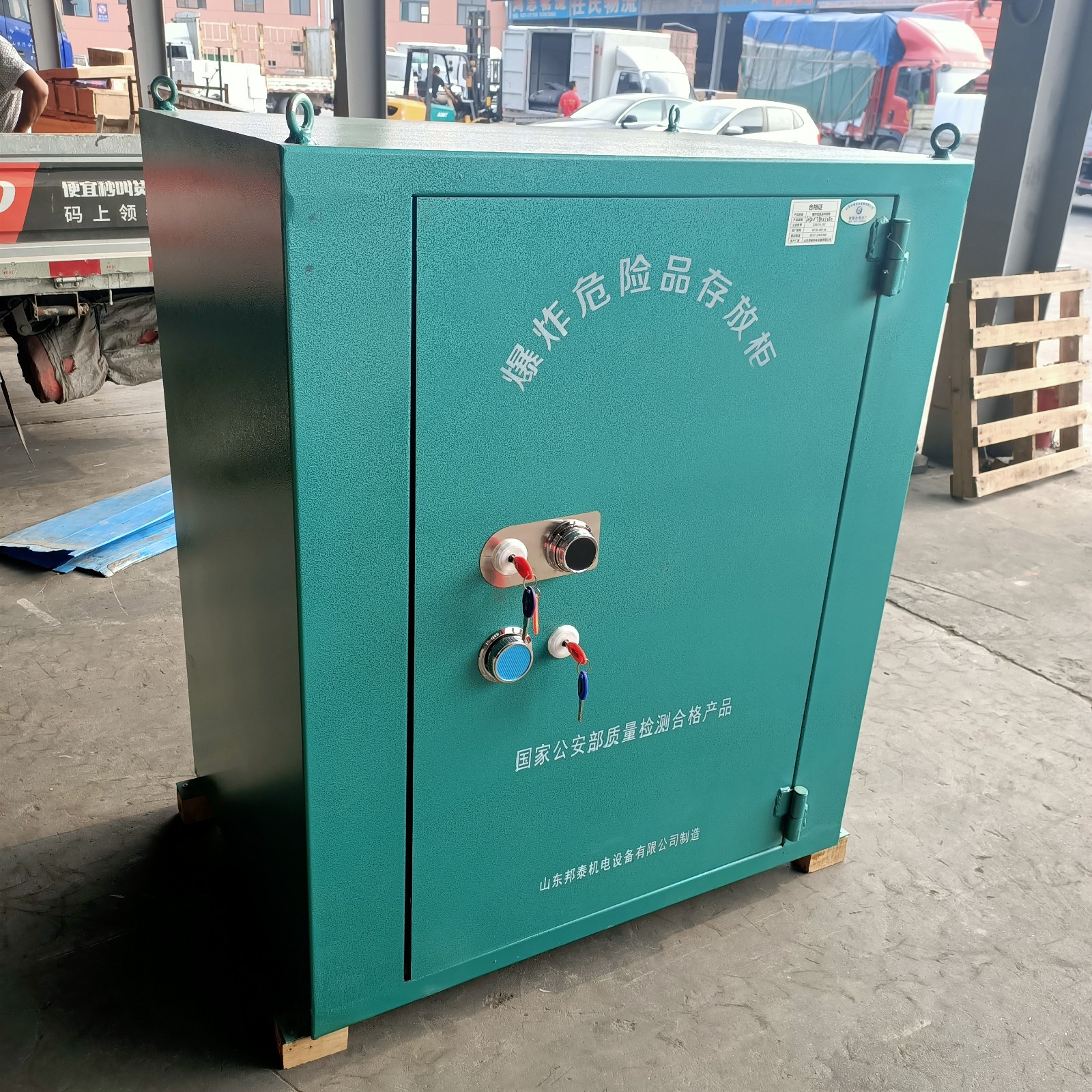 經(jīng)由道路運(yùn)輸民用爆炸物品的一款專用存放柜,也叫移動式民爆物品存放柜,可固定放在存取處,也可放置于車上,用于車載式運(yùn)輸,由于存放物品性質(zhì)的特殊性,對存放柜是有嚴(yán)格要求的,具有防爆,防靜電,防盜等特性,材質(zhì)組成分別是鋼板+絕緣木板+防靜電氈墊,由于外層鋼板厚度要求不得低于6mm,柜體堅硬,不易變形,有效防護(hù)民爆物品的存放安全,門板上安裝有兩把十字機(jī)械鎖和一個密碼鎖,鑰匙由專業(yè)人員存放。