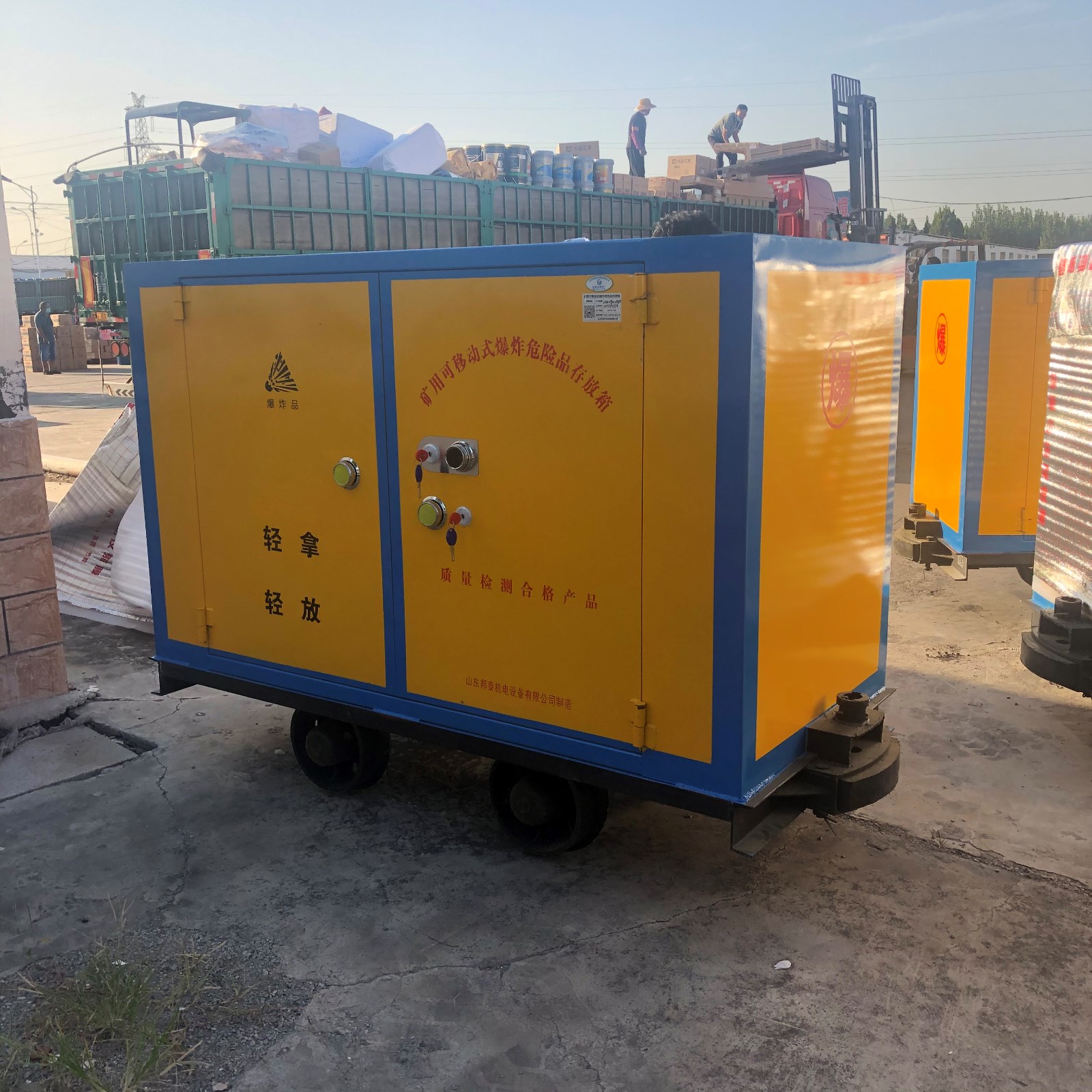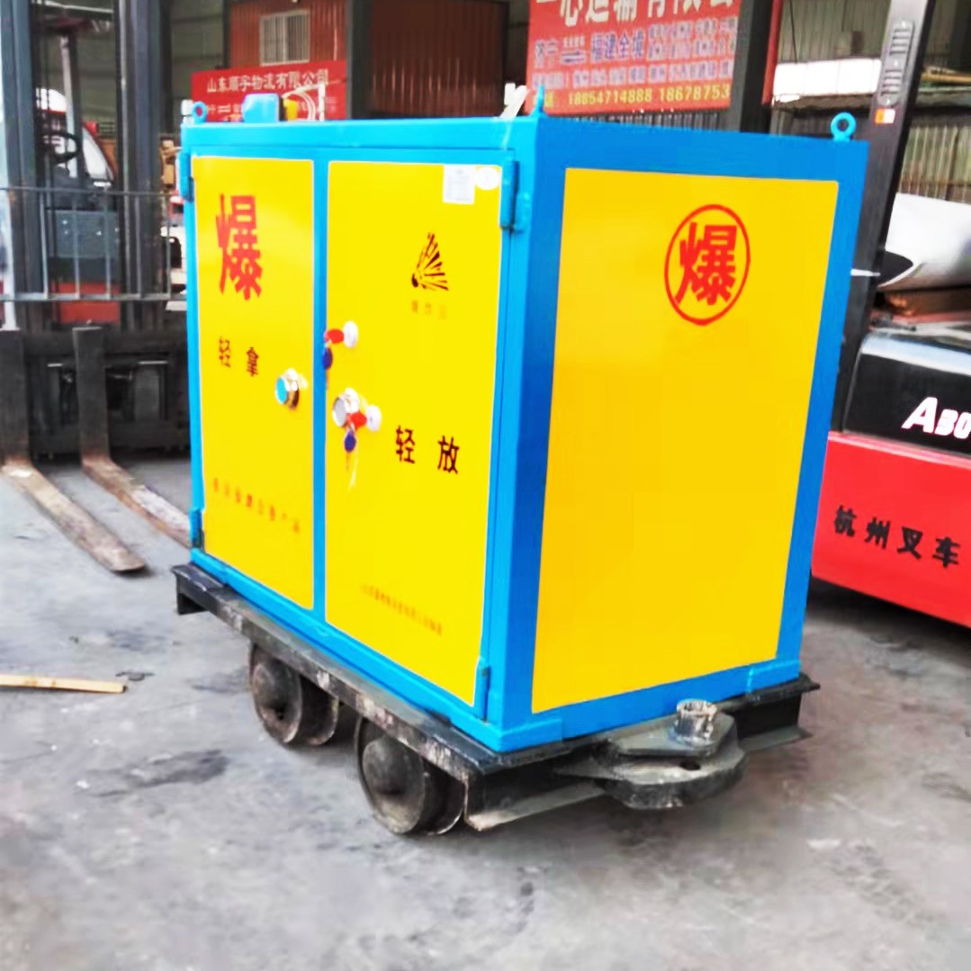 運(yùn)輸車由礦對輪和存放柜兩部分構(gòu)成,軌距根據(jù)礦山實(shí)際軌距選擇,存放柜體具有防爆,防靜電的作用,材質(zhì)為鋼板焊接而成,鋼板厚度約為6-8mm,鋼板內(nèi)部是絕緣木板和防靜電阻燃?xì)謮|,氈墊鋪滿柜體內(nèi)壁,也會(huì)起到防震的作用。存放柜體經(jīng)專業(yè)檢測部門檢測,取得了公安檢測報(bào)告,防爆檢測報(bào)告 ,防靜電檢測報(bào)告,為礦山施工帶來安全保障。