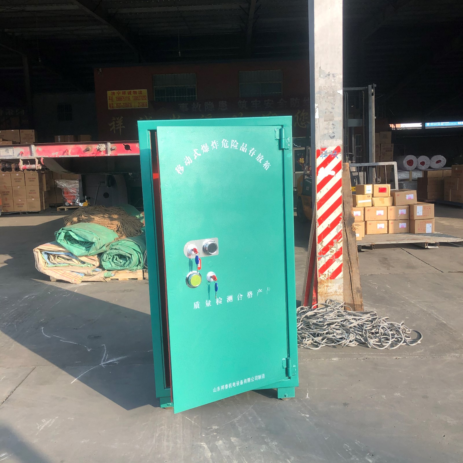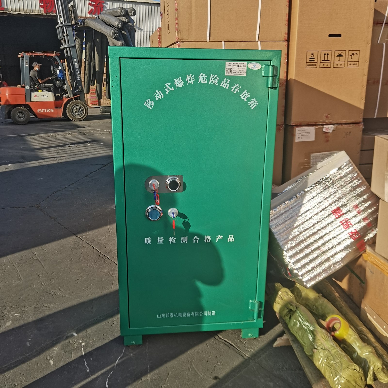 BTJD-001可移動式爆破器材存放柜,用于儲存具有易燃易爆性質(zhì)的危險品,常用于礦山開采,隧道工程,鐵路建設(shè)等需要涉及到爆破施工的場所,用來防護(hù)爆破物品存放的安全,采用了加厚鋼板材質(zhì)制作而成的柜體能夠有效抵御外部的沖擊和撞擊,這種材質(zhì)的柜體堅固耐用,使得在存放過程中更加安全可靠,除了加厚鋼板材質(zhì)的柜體,這款可移動式炸藥存放柜還采用了多種防護(hù)措施來確保炸存放的安全:柜門配備了堅固的雙鎖裝置,配有一套密碼鎖和十字鑰匙鎖,這款存放柜還采用了四輪移動裝置,可以輕松地在工作場所內(nèi)進(jìn)行移動,不僅如此,柜體頂部還可加裝吊環(huán),便于起吊運(yùn)輸。