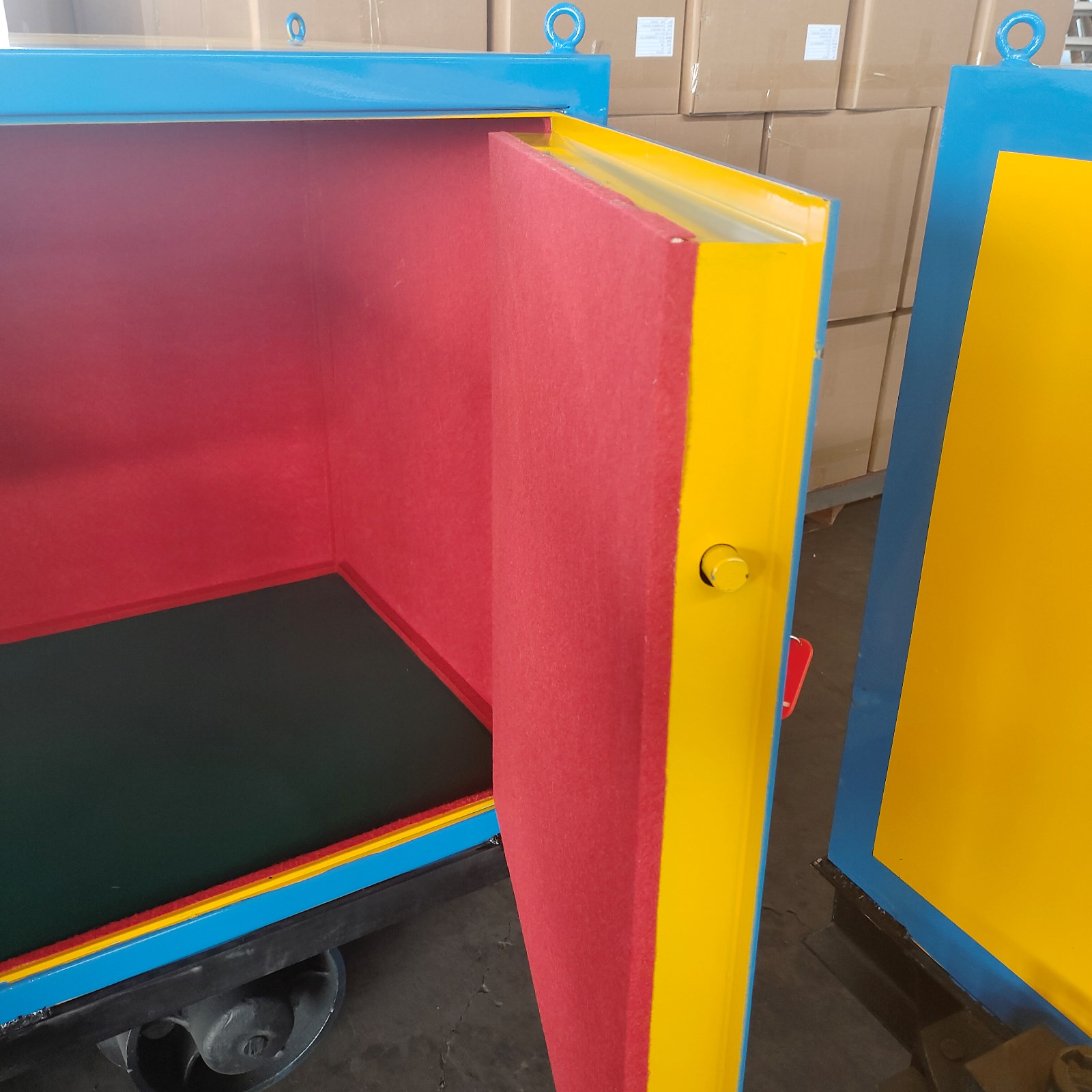 其次,我們的有軌式炸藥運輸車采用了堅固的鋼板材質(zhì)制成,堅固耐用,焊接處平整結(jié)實,在存放柜體內(nèi)部做防靜電處理,底部鋪設(shè)一層防靜電軟墊,能夠有效減震,保護(hù)炸藥運輸過程中的安全。在礦井工作環(huán)境中,地面的坑洼和顛簸是不可避免的,缺乏良好的減震效果可能對內(nèi)部運輸物品造成損壞,所以在柜體內(nèi)部做減震處理,能夠確保炸藥在運輸過程中的安全性。