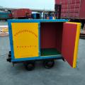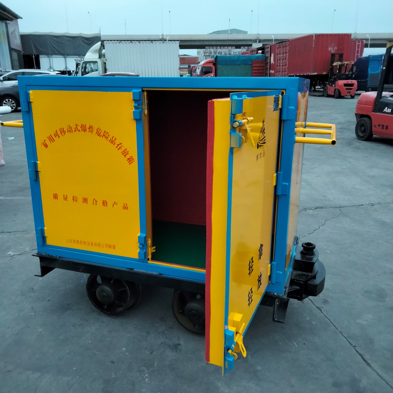 車體分為上下兩個(gè)部分,上部分為存放載體,用于儲(chǔ)存火工危險(xiǎn)品,下部分為運(yùn)輸載體,用于軌道上行駛運(yùn)輸;鸸て反娣殴癖仨毞戏辣漓o電的要求,材質(zhì)為冷軋鋼板焊接而成,鋼板厚度為不低于6mm厚度,才符合防爆檢測資質(zhì),內(nèi)部為木板和防靜電氈墊材質(zhì),有效預(yù)防產(chǎn)生靜電的同時(shí)也起到防震作用。下部分的運(yùn)輸載體即為礦車底盤,根據(jù)不用軌距,可定制600mm/762mm/900mm的軌距。