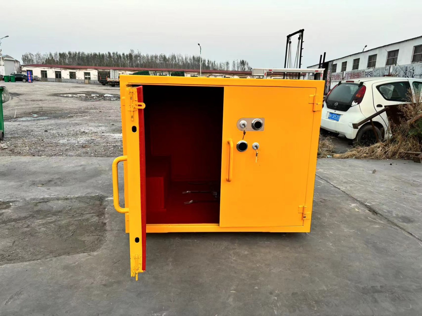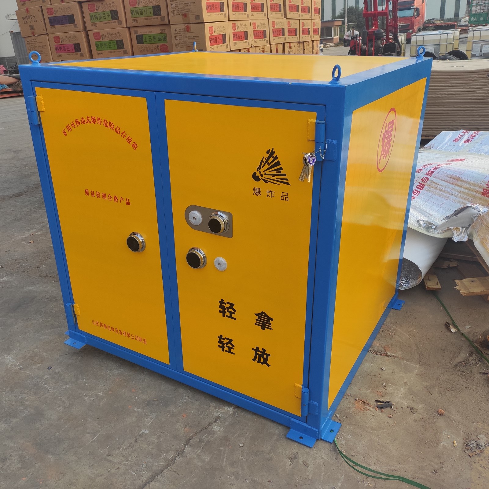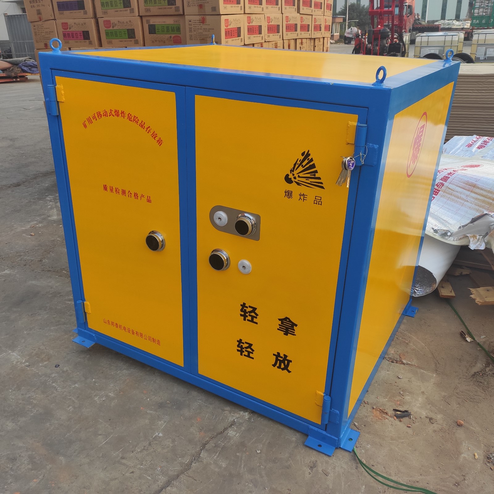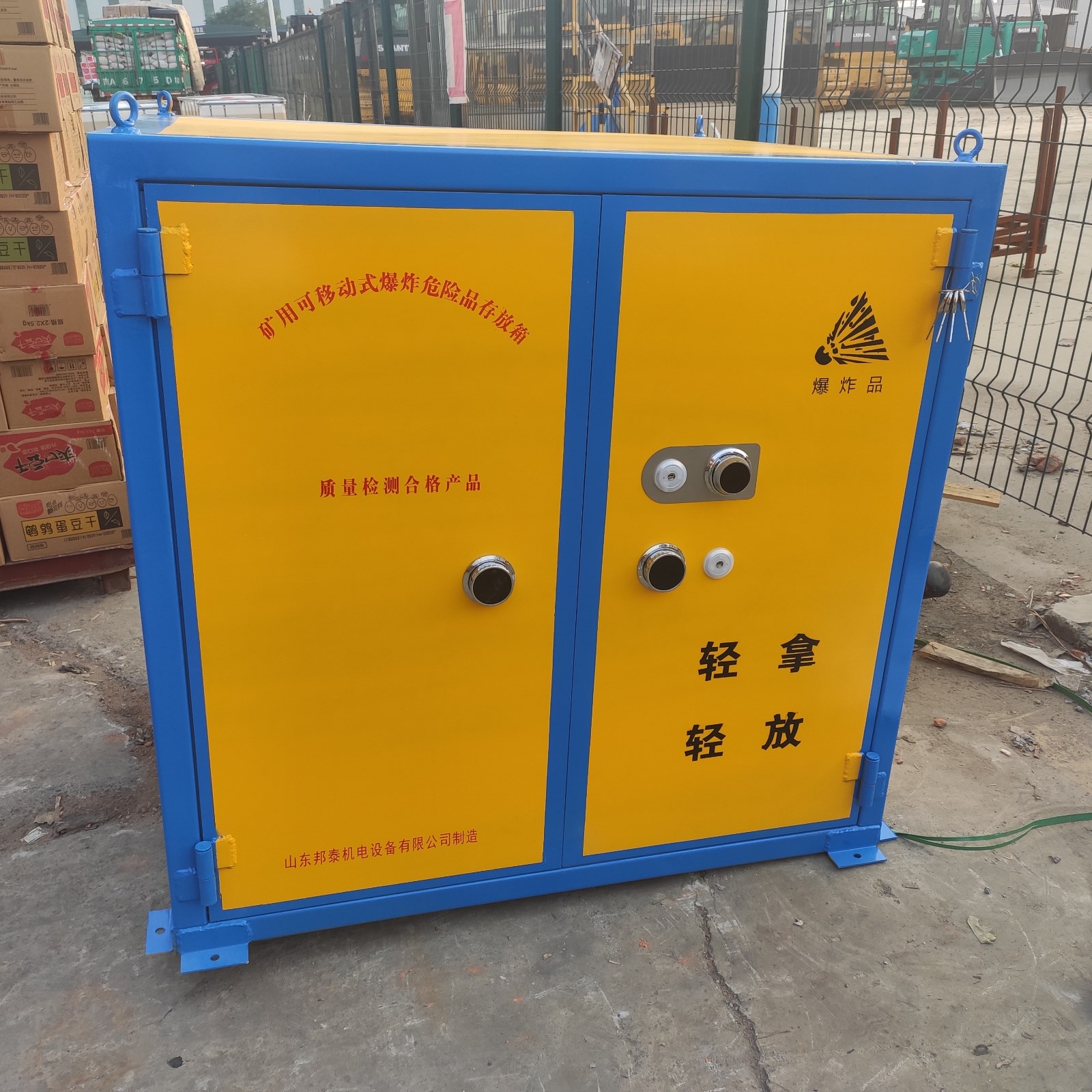經(jīng)由道路運(yùn)輸民用爆炸物品的一款專用存放柜,也叫移動(dòng)式民爆物品存放柜,可固定放在存取處,也可放置于車上,用于車載式運(yùn)輸,由于存放物品性質(zhì)的特殊性,對(duì)存放柜是有嚴(yán)格要求的,具有防爆,防靜電,防盜等特性,材質(zhì)組成分別是鋼板+絕緣木板+防靜電氈墊,由于外層鋼板厚度要求不得低于6mm,柜體堅(jiān)硬,不易變形,有效防護(hù)民爆物品的存放安全,門板上安裝有兩把十字機(jī)械鎖和一個(gè)密碼鎖,鑰匙由專業(yè)人員存放。