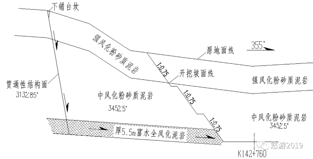 1、開挖邊坡的坡向355°,構(gòu)成坡體的巖體產(chǎn)狀345°∠5°,雖然為近水平狀地層,但略向外傾。從而導(dǎo)致后部寬緩的山體地下水長期向工程邊坡方向滲流,并在相對隔水的泥巖部位富集,從而為底錯帶的形成創(chuàng)造了條件。