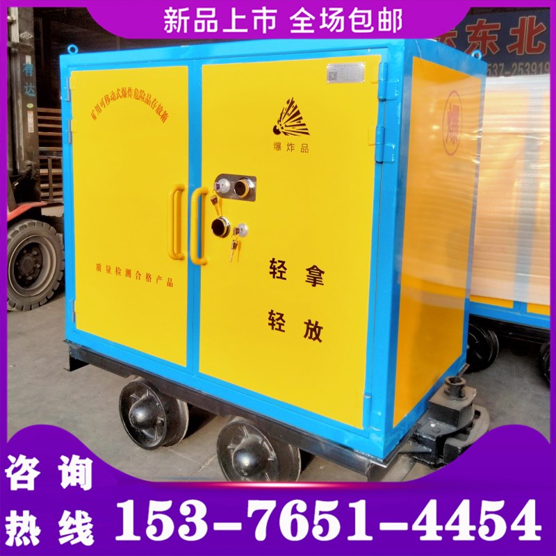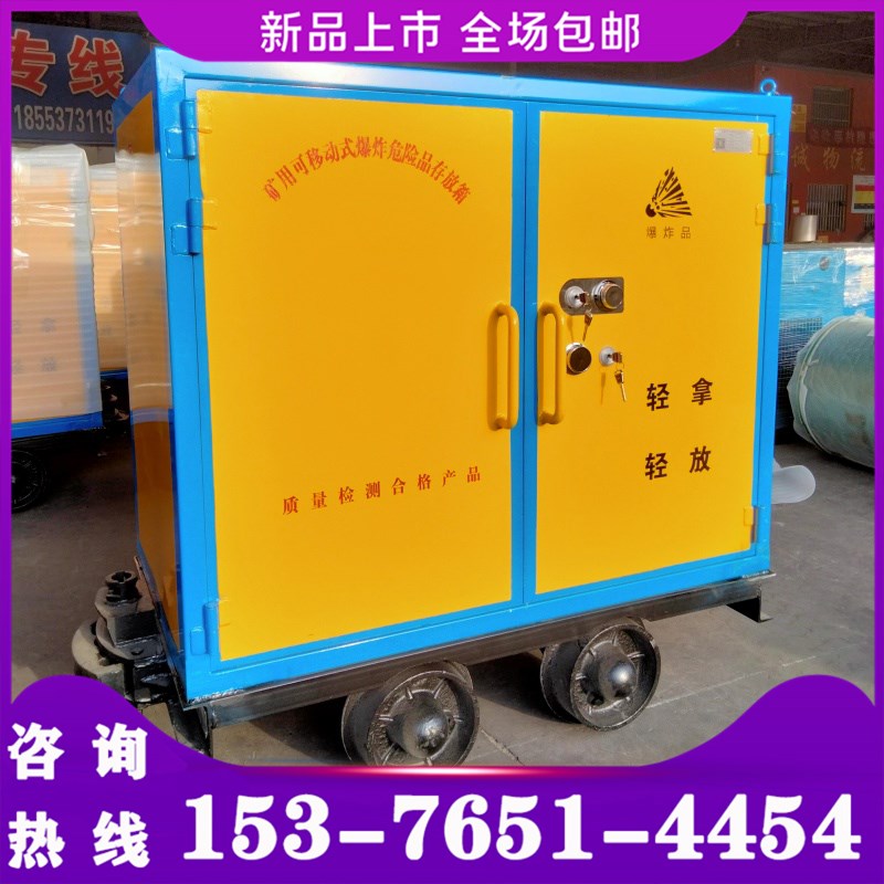 礦山井下生產(chǎn)的一款專門放置導爆管,電雷管,炸藥,爆破火工品等爆破器材的儲運柜。全稱為:“礦井軌道炸藥運輸車”。運輸車主要分為兩部分組成; 第一部分是爆炸危險品存放柜,柜 子 6.0mm-8.0mm 厚防爆鋼板,內(nèi)置10.0mm 防靜電木板和1.0mm 厚防火 防震的阻燃氈。另一部分為專用礦車,輪對軌距為標準 600mm 軌距。 運輸車滿足大部分有軌