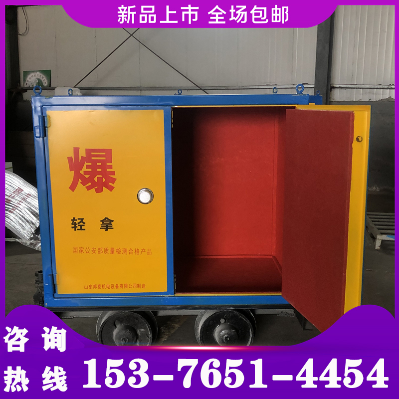 礦山井上井下軌道運(yùn)輸爆破器材的要求,集儲(chǔ)存,運(yùn)輸于一體的功 能,具有防爆、防震、防盜、防火、防靜電等特點(diǎn)。帶有《公安檢測(cè)認(rèn)證》 ,《合格證》 以及《礦安認(rèn)證》 。運(yùn)輸車配有牽引裝置,由三環(huán)鏈、插銷和插銷座組成,可以將多個(gè) 運(yùn)輸車連接成車組并傳遞牽引力。 礦井軌道炸藥運(yùn)輸車使用:標(biāo)準(zhǔn)運(yùn)輸車為雙開門,雙鎖配置(可配置機(jī)械密碼鎖)。 鑰匙應(yīng)有兩人分開保管,存放或取用時(shí)有兩人同時(shí)在場(chǎng)方可操作使用?砂匆蠖ㄖ茊蚊 開門或者兩面開門方便在不同環(huán)境中開門,存取物品。 注:第一次打開存放柜前應(yīng)首先確認(rèn)存放柜內(nèi)外有無破損、松動(dòng),然后再打開柜子存放 或取用操作,使用存放時(shí)必須嚴(yán)格區(qū)分存放物品種類,嚴(yán)禁雷管和炸藥混放