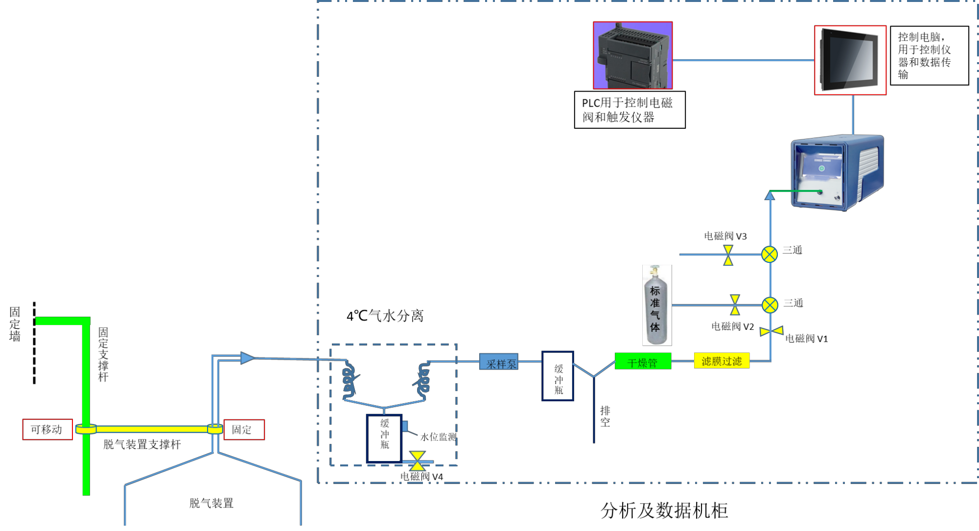在線式監(jiān)測系統(tǒng)建設(shè)分為兩部分,第一部分為樣品采集,主要用于溫泉氣體的采集;第二部分為溫泉氣體的預(yù)處理、分析和數(shù)據(jù)分析及上傳。