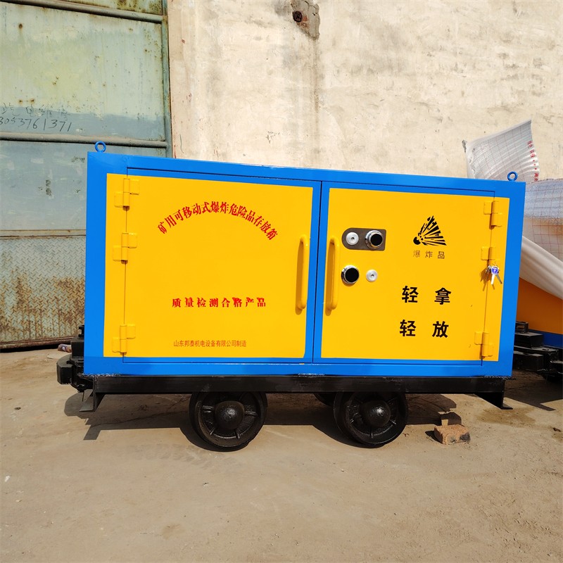 上半部分為外置6-8mm厚的防爆鋼板,內(nèi)置10mm厚的絕緣木板及2.0mm的防靜電膠墊和抗震阻燃?xì)纸M成的礦用可移動(dòng)式爆炸危險(xiǎn)品存放箱;下半部分為可供600軌距、762軌距、900軌距軌道使用的礦用材料車。