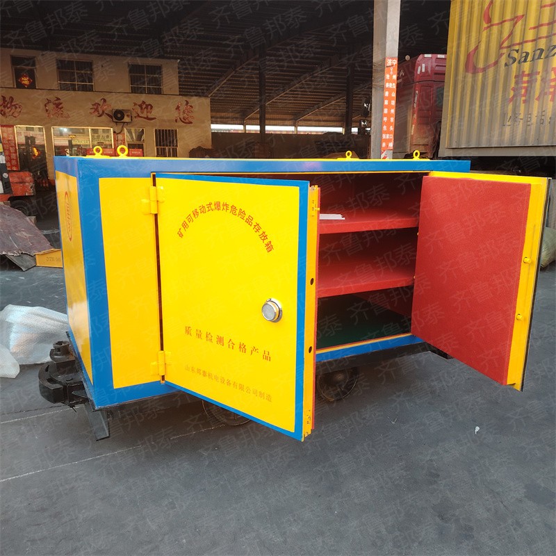 上半部分為外置6-8mm厚的防爆鋼板,內(nèi)置10mm厚的絕緣木板及2.0mm的防靜電膠墊和抗震阻燃?xì)纸M成的礦用可移動式爆炸危險品存放箱;下半部分為可供600軌距、762軌距、900軌距軌道使用的礦用材料車。