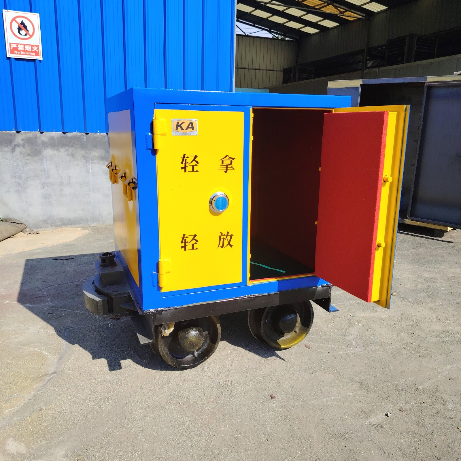 上半部分為外置6-8個厚的防爆鋼板,內(nèi)置10個厚的絕緣木板及2個厚的防火防震防靜電的阻燃墊組成的礦用爆破箱;下半部分為可供600軌距、762軌距、900軌距軌道使用的材料車。