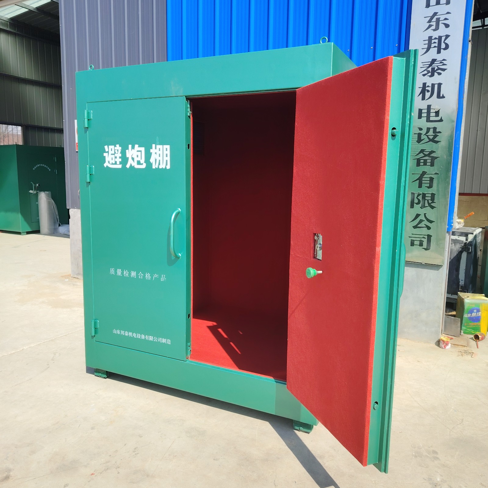BTJD-001型防爆避炮棚(可移動式安全防護(hù)棚),按標(biāo)準(zhǔn)至少需要門板6~10MM厚防爆鋼板可防止大部分的碎石落石沖擊,內(nèi)襯絕緣木板,內(nèi)部鋪設(shè)阻燃防靜電墊,具有抗震抗靜電作用。避炮棚設(shè)置有通氣窗和觀察窗十分方便觀察現(xiàn)場情況。內(nèi)外可開鎖方便人員進(jìn)出設(shè)有通氣孔方便躲避人員呼吸,一面設(shè)有觀察窗方便觀察情況。