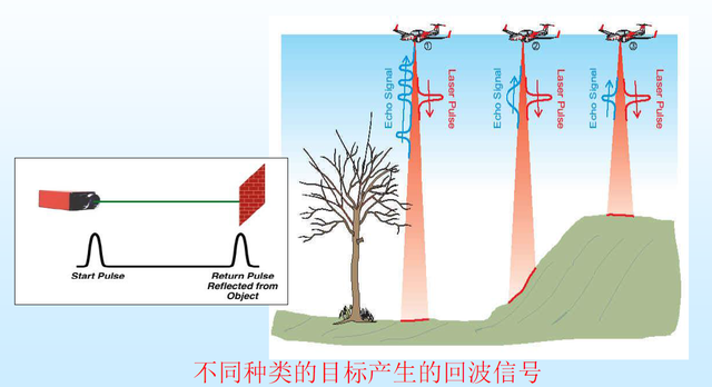 激光的地形測量原理和側(cè)視雷達(dá)一樣,是一種主動式遙感系統(tǒng)。這一技術(shù)包括使用激光脈沖定向照射目標(biāo)并測量脈沖的往返時間,通過處理每個發(fā)射的脈沖經(jīng)過目標(biāo)反射后返回到傳感器的時間,可以計算出傳感器到地面或者其他目標(biāo)之間的距離。