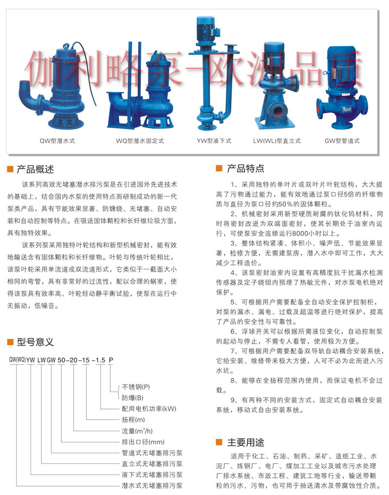 WQ系列無堵塞潛水排污泵適用用于工廠商業(yè)嚴(yán)重污染廢水的排放、主宅區(qū)的污水排污站、城市污水處理廠派水系統(tǒng)、人防系統(tǒng)排水站、自來水廠的給水設(shè)備、醫(yī)院、賓館的污水排放、市政工程建筑工地、礦山配套附機、農(nóng)村沼氣池、農(nóng)田灌溉等行業(yè),輸送帶顆粒的污水,污物,也可用于清水及帶弱腐蝕性介質(zhì)。