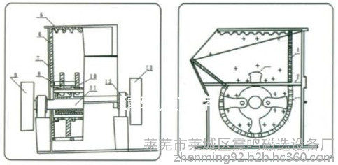 1.直篩板 2.托軸 3.弧形篩板 4.甩錘 5.反擊板 6.襯板 7.機殼 8.銷軸 9.皮帶輪 10.圓盤 11.主軸 12軸承座 13.飛輪