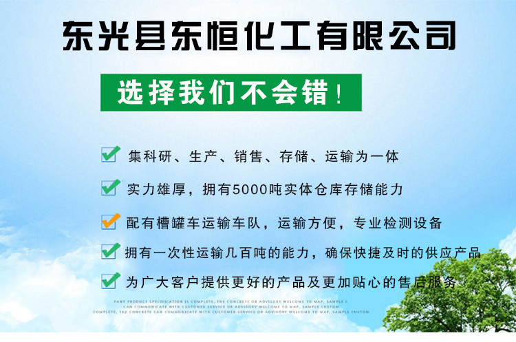公司實(shí)力雄厚,擁有5000噸實(shí)體倉庫存儲(chǔ)能力,配有槽罐車運(yùn)輸車隊(duì),專業(yè)檢測(cè)設(shè)備嚴(yán)格控制產(chǎn)品質(zhì)量。具有3000噸罐儲(chǔ)存
