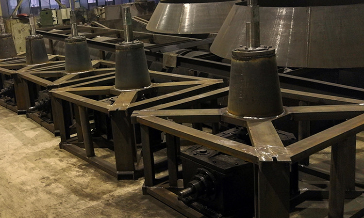 該設(shè)備主要有動(dòng)力裝置、機(jī)架、水盆、碾輪、碾盤(pán)等部件組成,采用輪動(dòng)式磨礦工作方式:首先電動(dòng)機(jī)將動(dòng)力傳動(dòng)至減速機(jī),在減速機(jī)帶動(dòng)下,通過(guò)大立軸將力矩傳遞給上方的橫軸,然后經(jīng)安裝在橫軸兩端的拉桿傳遞至碾輪,使碾輪產(chǎn)生驅(qū)動(dòng)力,沿橫軸水平方向做逆時(shí)針旋轉(zhuǎn)運(yùn)動(dòng);工作時(shí)的碾輪既能?chē)@濕碾機(jī)大立軸公轉(zhuǎn),又能?chē)@碾輪中心軸進(jìn)行自轉(zhuǎn),碾盤(pán)則固定不動(dòng)。添加的礦石物料,在碾磨機(jī)內(nèi)受到來(lái)自碾輪自身重量帶來(lái)的擠壓力,碾輪公轉(zhuǎn)自轉(zhuǎn)時(shí)與碾盤(pán)產(chǎn)生的巨大摩擦力,在受到反復(fù)的擠壓、揉搓、研磨后,被徹底粉碎。